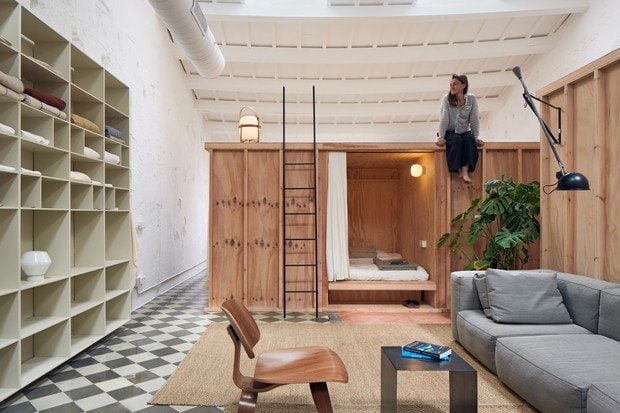 O ambiente foi compartimentado com o uso inusitado da marcenaria. Os arquitetos idealizaram móveis de linhas retas e grandes caixas em pinho Flanders que formam oito quartos – dois duplos e seis individuais -, com futons de algodão orgânico e lã, lençóis de linho e cortinas. Com uma escada, é possível acessar um mezanino logo acima.